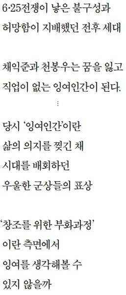 전쟁의 비극은 종전과 함께 사라지는 것이 아니다. 그 후로도 오랫동안, 언제 끝날지 알 수 없을 정도로 오랫동안 매일 매시 살아남은 사람들을 치고 때리고 할퀸다. 당시 잉여인간은 전쟁의 발톱에 삶의 의지를 찢긴 채 시대를 배회하던 우울한 군상의 표상이다.