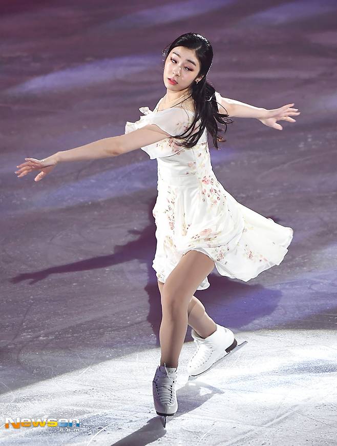 이날 전 피겨스케이팅 선수 김연아가 멋진 공연을 하고 있다.