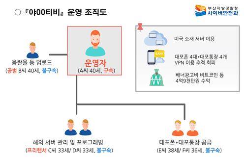 부산경찰청 사이버안전과는 성폭력범죄의 처벌 등에 관한 특례법 위반과 정보통신망 이용촉진 및 정보보호 등에 관한 법률 위반 혐의로 음란사이트 '야○티비' 운영자 A(40) 씨를 구속했다고 19일 밝혔다.