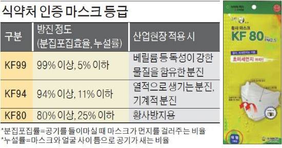 미세먼지 마스크는 제품 포장에 ‘의약외품’이라는 문구와 입자 차단 성능을 나타내는 KF80, KF94, KF99 표시가 반드시 있어야 합니다. KF(Korea Filter)는 문자 뒤에 붙은 숫자가 클수록 미세입자 차단 효과가 큽니다. 다만 효과가 클수록 숨쉬기 어렵거나 불편할 수 있기 때문에 황사·미세먼지 발생 수준과 개인별 호흡량 등을 고려해 제품을 선택하는 게 좋습니다. KF80은 평균 0.6마이크로미터(㎛) 크기의 미세입자를 80% 이상, KF94와 KF99는 평균 0.4㎛ 크기의 입자를 각각 94%, 99% 이상 걸러낼 수 있는데요.