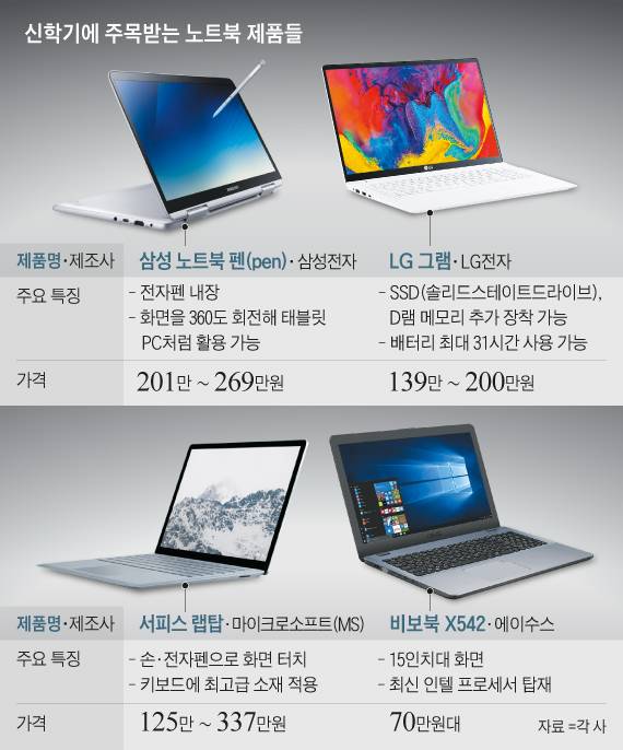 올해의 노트북 트렌드는 '편의성'이다. 터치 화면과 전자펜을 적용해 직접 화면에 필기할 수 있고, 태블릿PC 겸용으로도 쓸 수 있는 제품이 주를 이룬다. 사용자의 얼굴이나 지문을 인식해 노트북 잠금이 풀리고 저장 공간이 부족하면 메모리를 추가 장착할 수 있는 제품도 출시됐다. 휴대성 면에선 무게 1.4㎏ 미만의 초경량 노트북이 대세다. 전자제품 유통점 롯데하이마트의 초경량 노트북 매출 비중은 2014년 27%에서 지난해 50%로 2배 가까이 뛰었다. 충전 없이 하루 종일 쓸 수 있을 만큼 배터리 성능도 지속적으로 향상되고 있다.