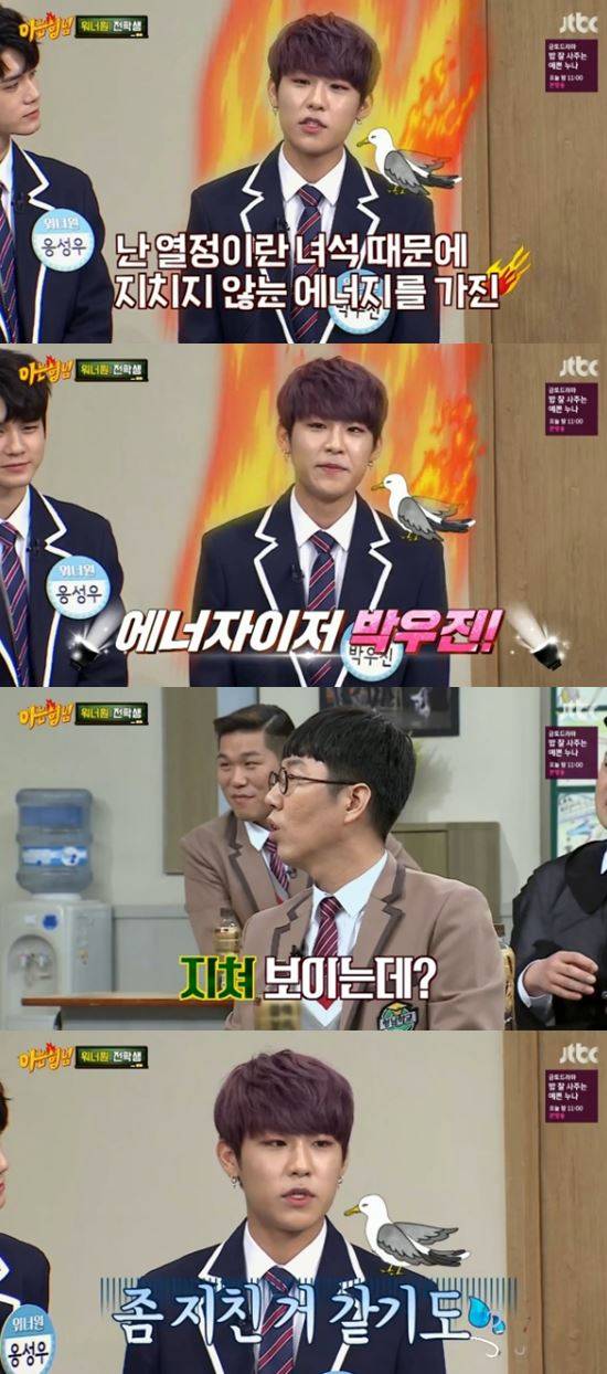 이어 박우진은 자신을 열정으로 인해 지치지 않는다고 소개했으나 '아는 형님' 멤버들은 이미 박우진이 지친 것 같다고 지적했다.