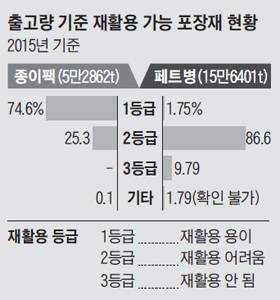 한국포장재재활용사업공제조합(이하 공제조합)에 따르면 국내 생산된 페트병 중 재활용이 쉬운 제품은 전체의 1.8%(2015년 기준)에 불과하다. 한 해 출고된 페트병 15만6401t 중 환경부가 '재활용 용이'로 분류한 1등급 제품은 2744t(1.75%)이었다. 반면 2등급(재활용 어려움)은 86.6%, 3등급(재활용 불가)도 9.79%로 1등급의 다섯 배가 넘었다. 생산 단계에서부터 '재활용 장벽'이 세워진 셈이다.