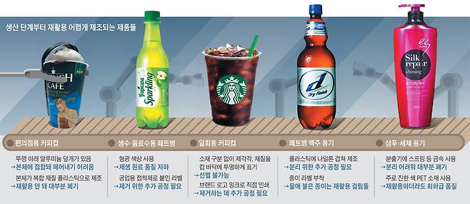 편의점에서 판매하는 휴대용 커피·주스 제품도 재활용을 고려하지 않은 대표적 사례다. 컵과 뚜껑, 빨대 등이 모두 다른 재질로 돼 있고, 요구르트병처럼 뚜껑이 알루미늄 재질로 된 경우도 많다. 전부 분리해야 재활용이 가능한데 뚜껑을 벗겨 내도 이번엔 알루미늄 조각들이 접합 부분에 그대로 남는다. 플라스틱 가공업체 관계자는 "애초 생산 단계부터 재활용이 어려운 제품이 너무 많다. 색깔과 재질만 통일해도 재활용 가치가 훨씬 높아진다"고 했다.