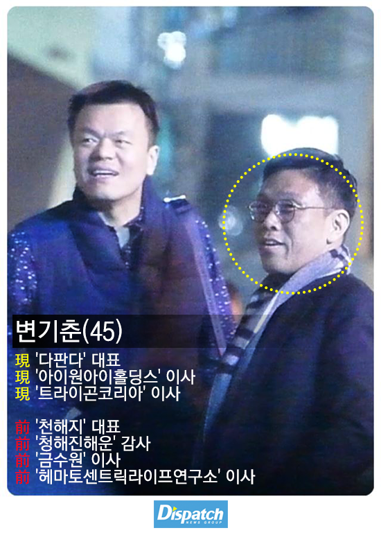 '디스패치'는 박진영과 변기춘이 환하게 웃고 있는 모습을 포착했다. 변기춘은 출소 이후 '구원파' 사업의 핵심을 차지했다. (주) 다판다, 아이원아이홀딩스, 트라이곤코리아의 대표이사를 맡고 있다.