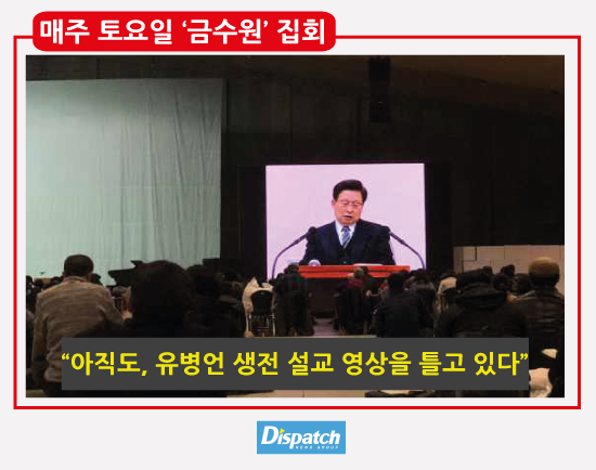'디스패치'는 매주 금수원을 찾았다. 현재 금수원은 권신찬과 유병언의 생전 설교 영상을 틀고 있다. 그들의 생전 '말씀'을 다시 들으며 구원을 찾고 있었다. (유병언 사망 이후 종교적 리더를 찾지 못한 모습.)