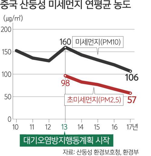 베이징뿐 아니라 문제의 산둥반도 역시 2013년부터 미세먼지 농도가 크게 줄었다. 산둥성의 미세먼지(PM10)는 2010년 152㎍/㎥에서 오르내리다 2013년 160㎍/㎥을 기록했다. 그러나 그 뒤로는 꾸준히 줄어 지난해 106㎍/㎥으로 4년새 34% 감소했다. 초미세먼지(PM2.5) 또한 2013년 98㎍/㎥에서 지난해 57㎍/㎥로 42% 줄었다.