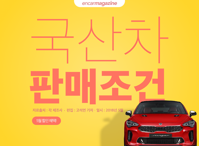완연한 봄을 알리는 5월이 찾아왔다. 조금씩 오르는 기온만큼이나 이시기에는 국산차의 판매량도 상승 곡선을 그리기 시작한다. 이번달, 어떤 조건들로 고객들을 지갑을 유혹하고 있을까?