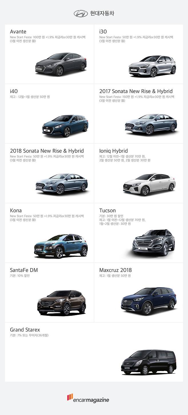 현대차의 5월 혜택은 지난 달과 비교해 큰 변화는 없다. 단, 쏘나타의 경우 2017년형에 한해 150만 원 할인과 함께 1.9% 저금리 할부를 제공하며, 아반떼는 3월 이전 생샌분을 100만 원 할인된 가격으로 판매한다.