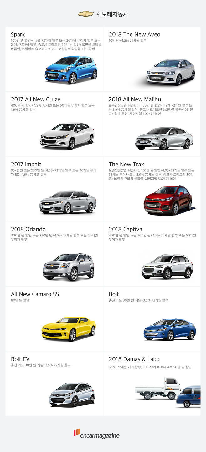 지난달까지 80만원 할인을 진행한 쉐보레의 스파크는 이번 달, 100만 원까지 확대했다. 트랙스 역시, 현금으로 150만 원을 지원하며, 올란도와 캡티바는 각각 300만 원, 400만 원을 할인해 판매한다.