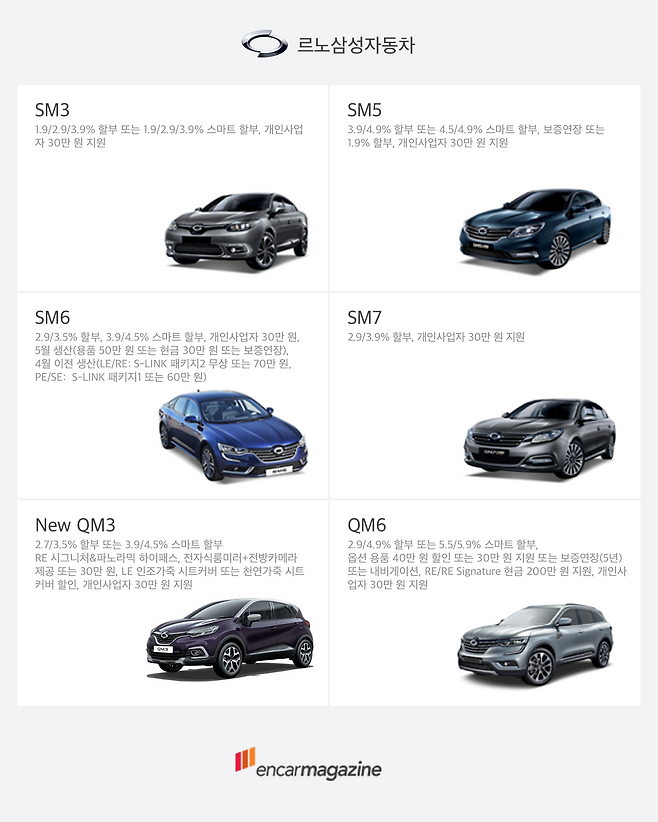 지난달 교원, 공부원에게 30만 원 혜택을 주었던 르노삼성자동차는 이번달, 개인사업자 대상으로 30만 원 추가 지원을 실시한다. 전반적으로 큰 변화는 감지되지 않지만 자세히 살펴보면 QM3는 할부 이율이 낮아진 반면, SM5는 이율이 높아졌다.
