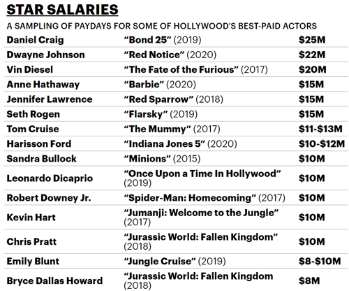 여배우 중 가장 많은 출연료를 받는다고 알려진 앤 헤서웨이와 제니퍼 로렌스는 각각 '바비'와 '레드 스패로우'에서 1500만 달러(약 162억 원)를 받았다. 로버트 다우니 주니어는 '스파이더맨: 홈커밍'에 10분만 출연하고도 1000만 달러(약 108억 원)의 출연료를 받았다. 버라이어티는 "'아이언맨' 중심의 영화는 2배 이상의 출연료가 든다"고 덧붙였다.