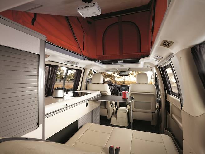 현대차는 신차에 베이지 컬러 고급 가죽 시트와 브라운 컬러 주름식 커튼, 주황색 계열 버밀리언 컬러를 적용한 팝업텐트로 신선하고 고급스러운 분위기를 연출했다. 또한 2열과 3열에 적용한 쿠션 시트는 0도부터 90도까지 기울기 조절이 가능해 수직으로 세워 수납공간을 확장하거나 완전히 평평하게 눕혀 취침공간으로 사용할 수 있어 실내 공간 활용성을 높인다.