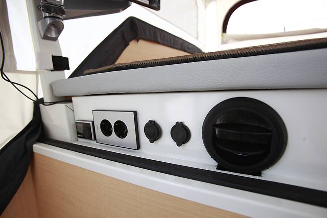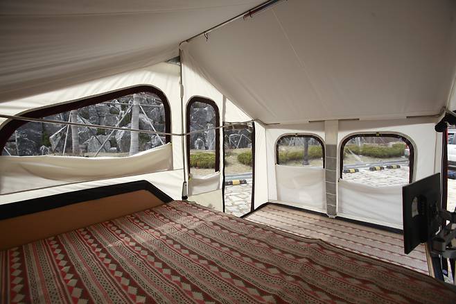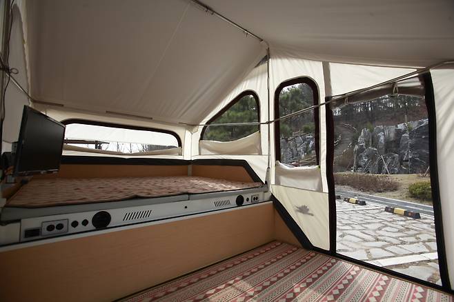 실내는 아늑하고 넓고 쾌적하다. 위 쪽의 매트리스를 접으면 하단에 커다란 수납 공간이 나타나며 무시동 히터와 LED 전구가 설치되어 편리하다. 동계 시에는 히터와 함께 전기 장판을 이용해 따듯하게 보낸 수 있고 외부 어닝룸을 추가로 연결해 실용적인 모습이다. 텐트 트레일러에서는 가장 시설이 잘 갖추어진 모델이다.