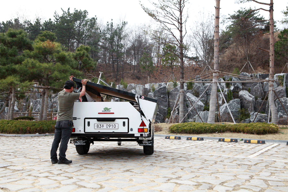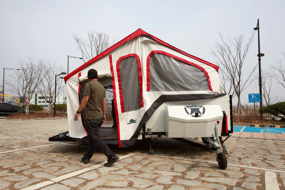 (주)아웃트리 캠프의 올로드 캠핑 트레일러는 캠퍼가 직접 제작한 만큼 다양한 편의사양과 요구 사항을 잘 반영하고 있다. EGI 강판, 분체 도장을 통해 차체의 부식을 방지하고 국산 액슬과 판스프링을 적용해 고속 주행은 물론 안전성을 높인 모델이다.