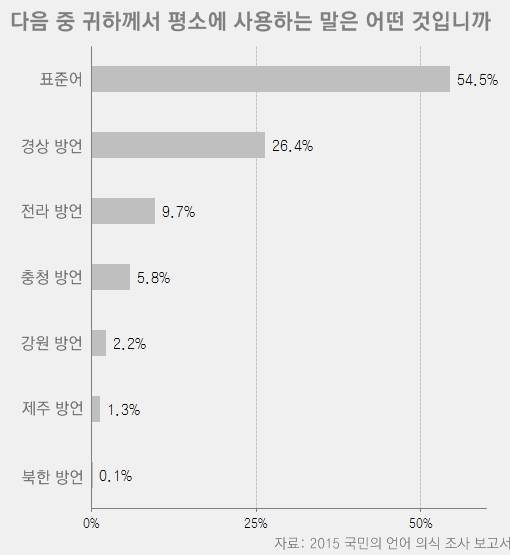물론 방언을 쓰는 게 절대 잘못은 아닙니다. 국립국어원에서 펴내는 ‘국민의 언어 의식 조사 보고서’ 가장 최신(2015년) 버전에 따르면 ‘평소에 사용하는 말’로 표준어를 꼽은 건 54.5%에 불과했습니다. 나머지 45.5%는 평소에 그 지역 방언으로 대화를 주고받는 겁니다.