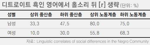 월트 울프람이라는 사회언어학자는 1969년 미국 디트로이트에 사는 흑인을 대상으로 홀소리 뒤에 [r]를 얼마나 발음하는지 계층과 성별에 따라 조사했습니다. 이 때는 홀소리 뒤에 [r]를 발음하는 게 표준형입니다.