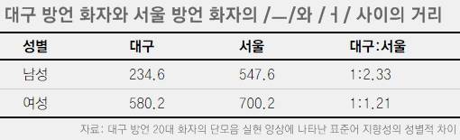 그 결과 대구에 사는 20대 남성은 이 차이가 234.6로 여성(580.2)의 절반도 되지 않았습니다. 남성이 여성보다 이 소리를 잘 구분하지 못하는 겁니다. 서울 지역하고 비교하면 남성 쪽은 서울과 대구 차이가 2.33배로 여성(1.21배)보다 컸습니다. 대구 지역 여성이 남성보다 서울 지역 발음과 더 비슷한 소리를 냈다는 뜻입니다. (좀 더 자세한 내용은 논문 ‘대구 방언 20대 화자의 단모음 실현 양상에 나타난 표준어 지향성의 성별적 차이’를 참고하시면 됩니다.)