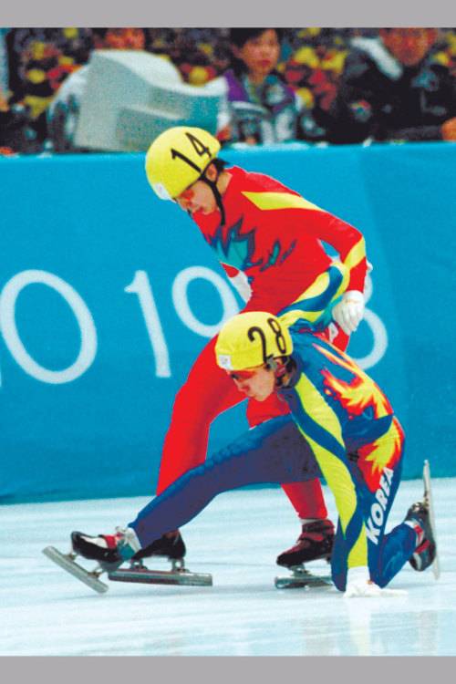 | 전이경(앞)이 1998 나가노올림픽 쇼트트랙 여자 1000m 결승에서 날 내밀기를 통해 양양S(중국)를 제치고 결승선을 먼저 통과하고 있다. 세계일보 자료사진 |