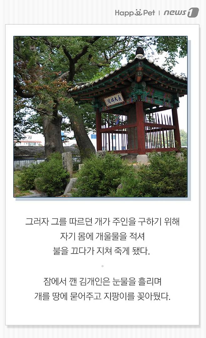 그러자 그를 따르던 개가 주인을 구하기 위해 자기 몸에 개울물을 적셔 불을 끄다가 지쳐 죽게 됐다. 잠에서 깬 김개인은 눈물을 흘리며 개를 땅에 묻어주고 지팡이를 꽂아뒀다.