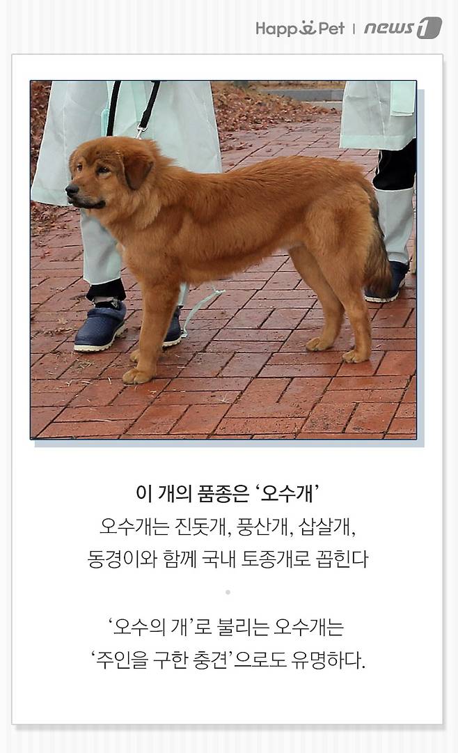 이 개의 품종은 '오수개'. 오수개는 진돗개, 풍산개, 삽살개, 동경이와 함께 국내 토종개로 꼽힌다. '오수의 개'로 불리는 오수개는 '주인을 구한 충견'으로도 유명하다.