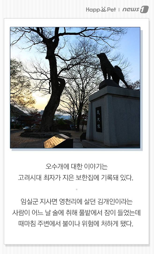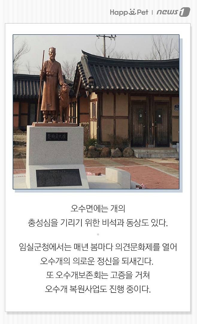 (서울=뉴스1) 최서윤 기자,방은영 디자이너 = 전북 임실군 오수면 원동산공원에는 특별한 비석이 있다. 주인을 구하고 죽은 개의 충성심을 후세에 알리기 위한 의견비(義犬碑)다. 오수역 앞에는 동상도 있으며 매년 4월(또는 5월)에는 의견제를 통해 개의 넋을 기린다. 이른바 '오수의 개'라고 불리는 개의 유래를 알아본다.