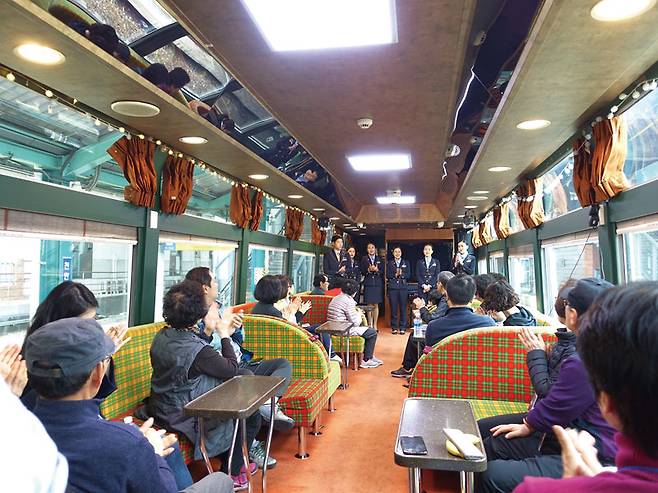1박2일 여정을 함께 할 승객들도 간단하게 자기소개를 하면서 거리를 좁힌다. 5살 아들 생일을 기념해 왔다는 가족부터 칠순 효도여행 왔다는 어르신 부부, 인생 최초로 자매끼리 여행 중인 이들까지 다채롭다. 그중에서도 유독 한 중년 부부가 시선을 끈다. 저 아저씨 진짜 상냥하다, 저렇게 좀 해보시지…. 다정스레 아내의 손을 잡고 있는 그 아저씨만큼 할 자신이 없어 벌컥 맥주를 들이키며 딴청을 부린다. 대신 마사지 해줄게, 어깨 마사지기를 걸어주니 웃는다.