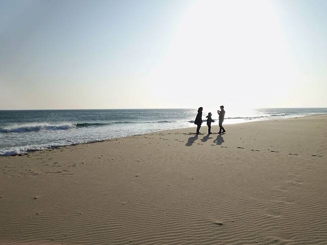 그러고 보니 여정 동안 참 잘 먹는다. 첫날 경주 한우구이와 경주 한정식도 모자라 해랑 카페도 번질나게 드나들었으니…. 간밤에 승무원들이 펼친 특별공연이 흥을 한껏 돋워 그랬던 모양이다. 난타공연부터 마술쇼까지 흥겨웠다. 생일이거나 기념일인 승객을 위해 케이크도 준비해 함께 축하하고 함께 나눠 먹었다. 생일을 맞은 시어머니께 보내는 며느리의 편지는 사랑스러웠다. 고부갈등이라는 말이 왜 나왔는지 모를 정도로! 그렇다고는 해도 남들 다 방에 돌아갔는데도 아내와 둘이서 끝까지 음주가무를 즐긴 건 좀 무리였다. 아침 메뉴가 황태해장국인 걸 보면 우리만 그러는 게 아닌 거야, 합리화해보지만 궁색하다. 망상해수욕장을 그냥 지나칠 수 없다. 파도 일렁이는 찬연한 아침 바다로 성큼성큼 다가간다. 먼저 와 있던 가족의 모습이 아침 햇살에 실루엣으로 일렁인다.