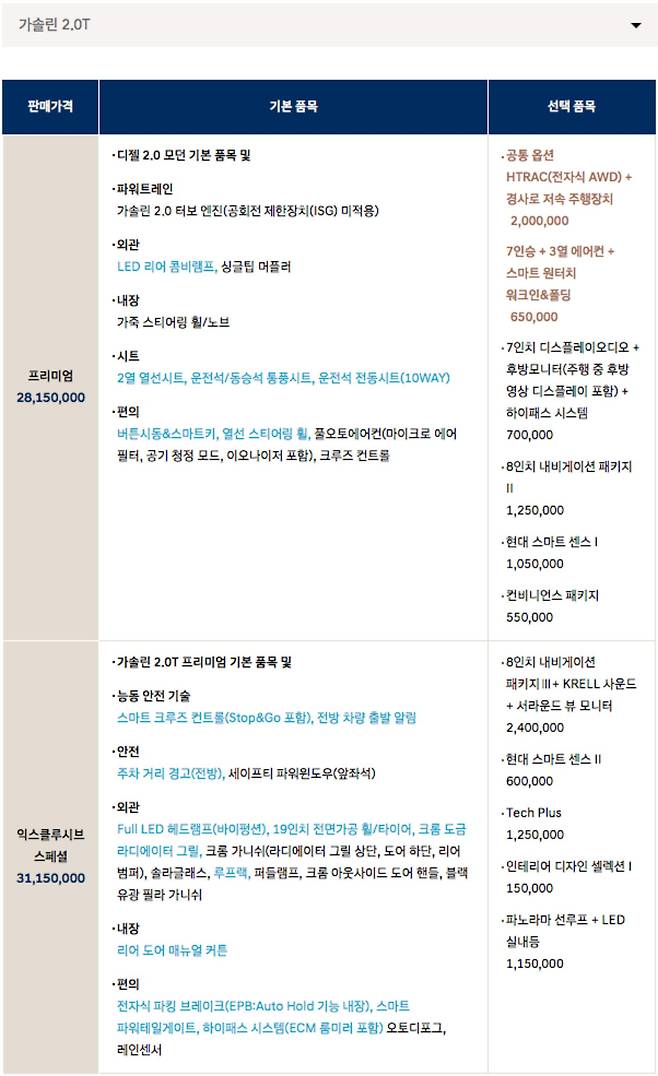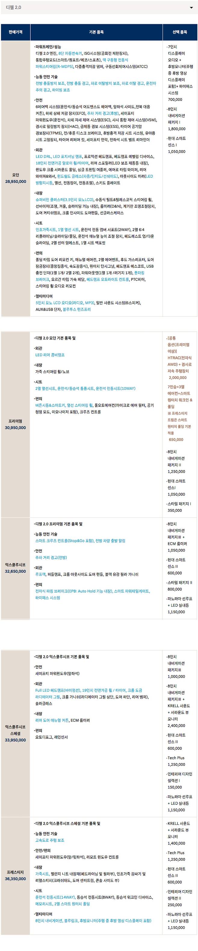 일단 등급별 가격은 디젤 2.0 모델이 ▲모던 2,895만원 ▲프리미엄 3,095만원 ▲익스클루시브 3,265만원 ▲익스클루시브 스페셜 3,395만원 ▲프레스티지 3,635만원