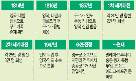 제1·2차 세계대전에 참가한 구르카 용병은 각각 약 20만명, 25만명이다. 두 전쟁에서만 5만명가량 숨졌지만 큰 손실에 비해 영웅적 행동은 눈에 띄지 않은 편이다.