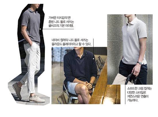 칼라가 달린 폴로 스타일은 비즈니스 캐주얼부터 트래블 룩까지 T.P.O에 맞춰 다양한 스타일링이 가능하다. 특히 타이를 생략한 쿨 비즈 룩의 기본 아이템으로 셔츠와 재킷을 같은 컬러로 통일하면 아주 멋스럽다. 대개 차분한 느낌의 짙은 컬러를 고르기 쉬운데, 팬츠를 아이보리나 베이지처럼 밝은 색으로 매치해보자. 화이트 스니커즈나 베이지 로퍼 등 신발 컬러도 가벼운 느낌이 잘 어울린다. 밝은 색 셔츠는 깔끔하고 스포티해 보인다. 화이트보다는 아이보리나 크림 계열이 은은하고 고급스럽다. 짙은 컬러에 비해 조금 여유 있게 입어야 멋스럽다.