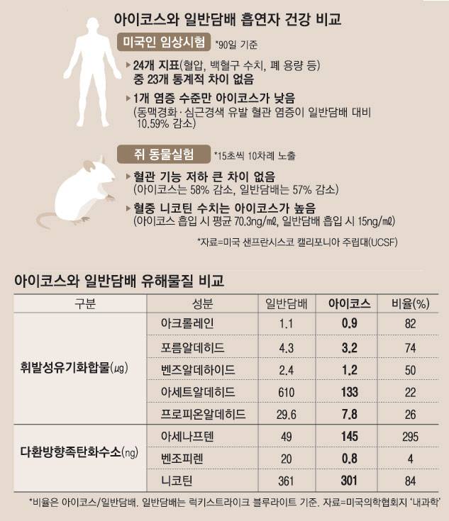 대표적인 궐련형 전자담배 '아이코스(IQOS)'에는 이런 의미가 담겨 있다. 지난해 5월 필립모리스가 아이코스를 한국에 들여온 이후 올해 들어 3월 말 현재 국내에서 팔린 아이코스는 1억6300갑에 달한다. 이 같은 인기몰이가 가능했던 것은 일반 담배에 비해 전자담배가 몸에 덜 나쁠 것으로 생각한 애연가가 대거 전자담배로 갈아탔기 때문이다. 실제로 전자담배 제조업체들은 전자담배가 일반 담배보다 유해물질이 최대 90~95% 적다며 대대적인 홍보전을 펼쳤다.