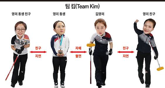 팀 킴이 화제가 된 것은 성과 때문만이 아니었다. 김초희(후보)를 제외한 김은정(스킵·주장), 김영미(리드), 김선영(세컨드), 김경애(서드) 등 주전 4명은 모두 마늘로 유명한 경북 의성군에서 중·고등학교를 함께 다니며 컬링을 해 온 친구·자매 사이였다. 김영미를 중심으로 영미 친구(김은정), 영미 동생(김경애), 영미 동생 친구(김선영) 넷이 한 팀인 것이다. 팀 킴은 스톤을 던지는 순서대로 화장실에 갈 만큼 팀워크가 생활화돼 있다.