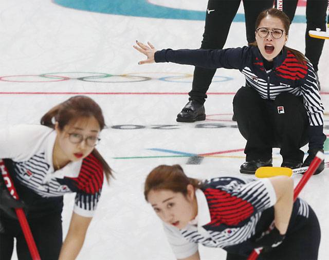 한국과 일본의 여자 컬링 준결승전에서 스킵 김은정이 스톤의 방향을 지시하며 소리치고 있다. <사진 : 연합뉴스>