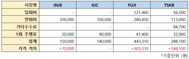 비용이 가장 많이 소요되는 후지 스피드웨이는 비교 대상 중 유일하게 FIA 1등급 서킷이다. 인제 스피디움과 KIC는 현재 FIA 2등급 수준으로 운영 중이다. 위 서킷 중에서 코스 길이가 가장 짧은 서킷은 츠쿠바 서킷이다.