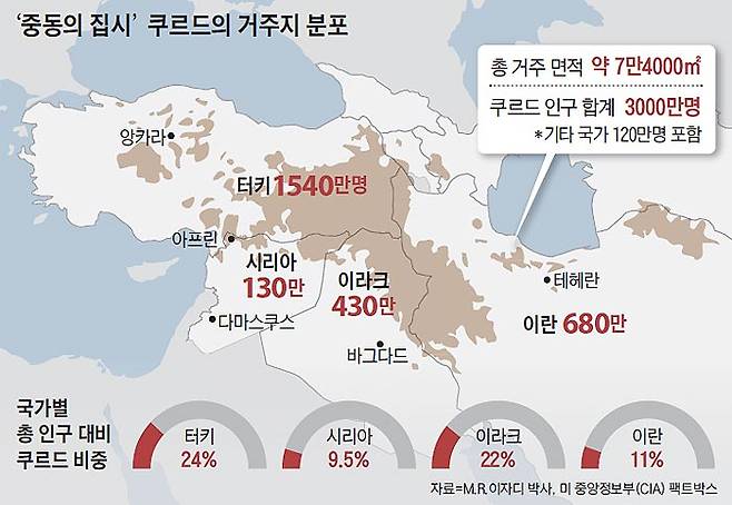 쿠르드는 아리안계 인종으로 기원전 3세기부터 중동 일대에서 고유의 언어와 생활양식을 지키며 살아왔다. 전체 인구가 3000만명에 이를 정도로 큰 민족이다. 하지만 한 번도 독립국가를 세우지 못하고, 터키(1540만명)·이란(680만명)·이라크(430만명)·시리아(130만명) 등 여러 나라를 떠돌며 흩어져 살고 있다. 이에 '중동의 집시(Gypsy)' 또는 '유랑 민족'이라 불린다.