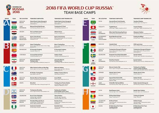국제축구연맹(FIFA)은 10일(한국시간) 공식 홈페이지를 통해 월드컵 조별리그에 참가하는 32개국이 선택한 대회 기간 머물 베이스캠프 장소를 공개했다.