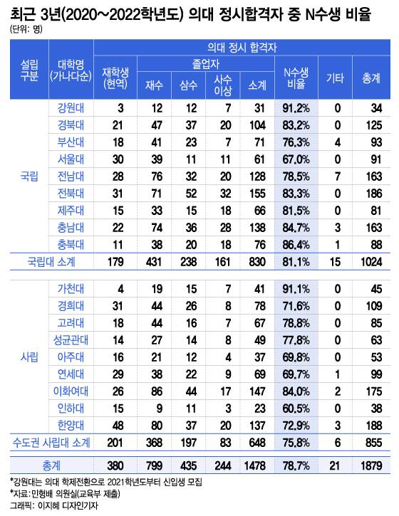 1일 교육부가 국회 교육위원회 소속 민형배 의원실에 제출한 '2020~2022학년도 의대 정시 합격자 현황'을 보면, 3년 간 의대 정시 합격자 중 N수생 비율은 78.7%다. 이 통계는 수험생 선호도가 높은 9개 국립대와 9개 수도권 사립대 의대의 정시 최초합계자를 대상으로 산출됐다. 경상국립대와 가톨릭대, 중앙대, 차의과대는 관련 자료를 제출하지 않았다.