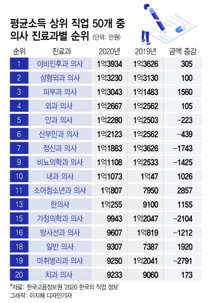 대체로 진료과별 소득이 높을수록 인기와 비례하는 모습이다. 한국고용정보원이 발표한 '2020 한국의 직업정보'에 따르면 '인기과'인 이비인후과(1억3934만원), 성형외과(1억3230만원), 피부과(1억3053만원) 의사의 평균소득은 전체 진료과 가운데 '톱3'에 나란히 들었다.