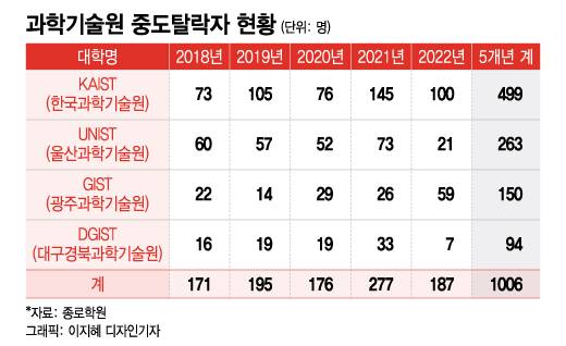 실제 한국대학교육협의회 대학알리미 공시 자료에 따르면, 4대 과기원에서 최근 5년간 1006명이 중도 이탈했다. 자퇴, 미등록, 유급 등으로 졸업하지 못한 이들로 대다수가 의학계열로 향한 것으로 추정된다. 카이스트의 경우 5년간 연평균 100명가량이 학교를 그만뒀다.