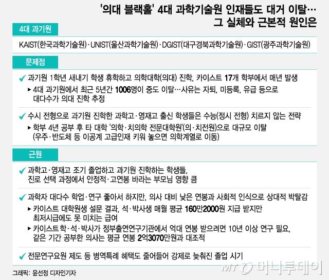 1일 머니투데이 취재를 종합하면, 카이스트를 포함한 4대 과학기술원에서 의학계로 떠나는 '이공계 엑소더스' 현상은 학과·학년을 불문하고 나타났다. 카이스트 17개 학부에서 매년 학교를 중퇴하고 의대를 가거나 졸업 후 의전원·치전원으로 향하는 사례가 나왔다. 유니스트(울산과학기술원)·디지스트(대구경북과학기술원)·지스트(광주과학기술원)도 마찬가지였다.