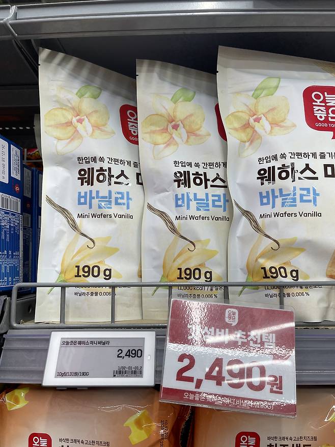 바삭한 웨하스와 진한 바닐라의 달콤한 풍미가 조화를 이루며 간식으로 적당해요.