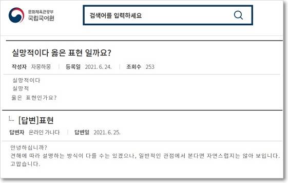 그러니 내 국어 상식으로는 아무리 생각해도 ‘실망적’만 왜 유독 이상하게 느껴지는 건지 그 이유를 잘 모르겠다. 왜 ‘실망적’은 ‘실망스러운’으로 고쳐야 할 것 같은 강한 문법적 억압을 만들어내는 걸까. 나만 그런 건 아닌 것 같다. 나처럼 ‘실망적’을 궁금했던 사람이 있었고, 그는 2021년 국립국어원에 이렇게 문의한다: