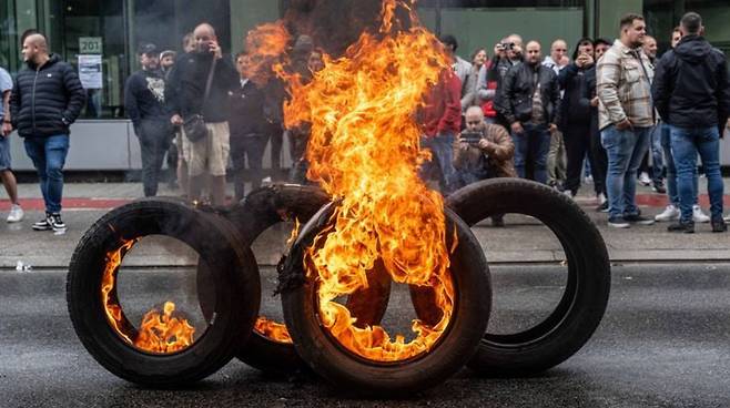 공장 폐쇄에 화가 난 브뤼셀 공장 직원들은 공장 앞에서 아우디를 상징하는 4개의 타이어에 불을 질렀다.