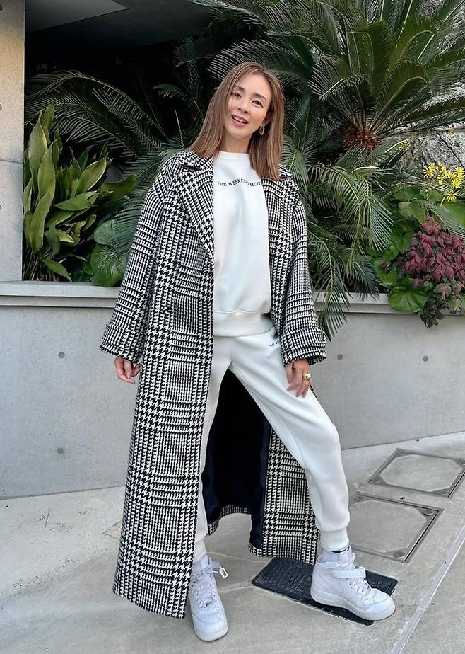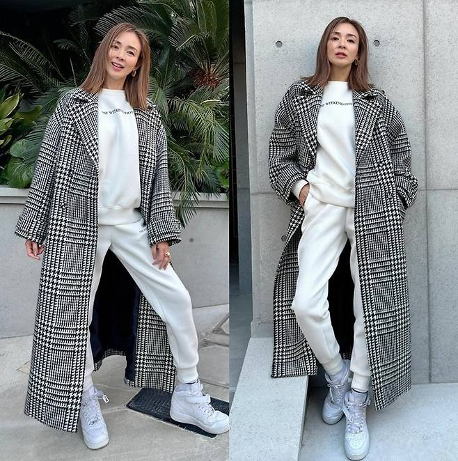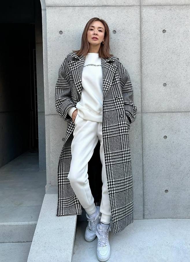 공개한 사진에서 야노시호는 화이트 스웻 팬츠와 셔츠 셋업에 체크 롱 코트를 입고 믹스앤매치의 진수를 선보였다.
