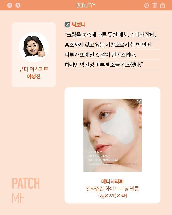 잡티 세럼을 굳혀 만든 제품으로 영양을 공급하고 주름을 탄력 있게 케어하며 환하게 밝혀준다. 붙이면 녹아서 얇아지는 멜팅 겔 타입. 저녁에는 20~30분, 아침엔 3분 정도 붙여두면 눈두덩 부기가 완화된다.