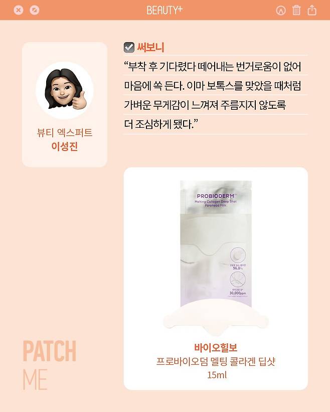 프랑스산 순수 콜라겐과 고순도 마이크로샷을 80mm 크기의 미세 나노 섬유로 제작한 녹는 콜라겐 딥샷 필름. 건강한 피부 환경을 조성해 꺼지고 거친 이마를 매끈하고 쫀쫀하게 케어한다.