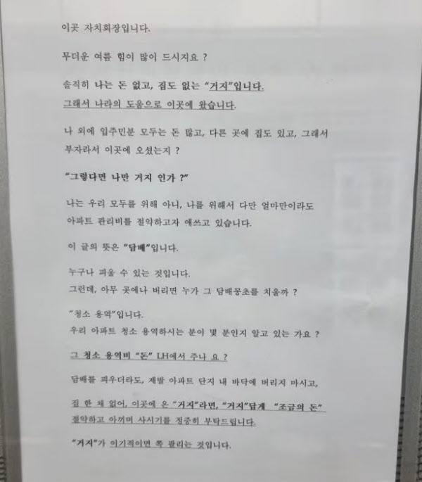 자치회장은 이 글에서 “솔직히 나는 돈 없고 집도 없는 ‘거지’다. 그래서 나라의 도움으로 이곳에 왔다. 나 외에 입주민분 모두는 돈 많고, 다른 곳에 집도 있고 부자라서 이곳에 오셨느냐”고 했다.