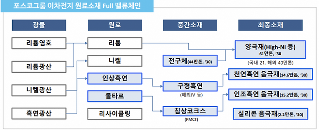 탄탄한 리튬 공급망을 구축해야 하는 전지업체에 포스코그룹의 광물 네트워크는 매력적이다. 양극재와 음극재, 리튬까지 전지 생산에 필요한 주요 소재와 원료를 한번에 조달할 수 있기 때문이다.
