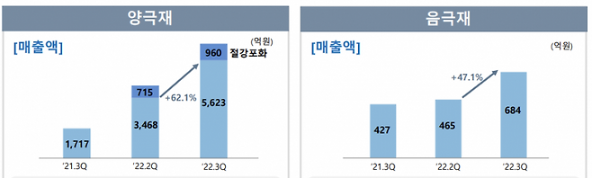 포스코케미칼은 중국 샨샨(Shanshan)과 함께 양극재와 음극재를 동시에 생산하는 유일한 업체이다. 양·음극재를 생산하는 에너지소재사업부는 올해 처음으로 매출 1조원을 넘었다. 올해 3분기 누적 매출은 1조5086억원을 기록했다. 양극재 매출은 1조3488억원을 기록했으며, 음극재는 1598억원의 매출을 달성했다. 2019년 3분기 에너지소재사업부 누적 매출은 약 1800억원에 불과했다. 포스코케미칼의 전지 소재 사업은 엄청나게 성장했다.